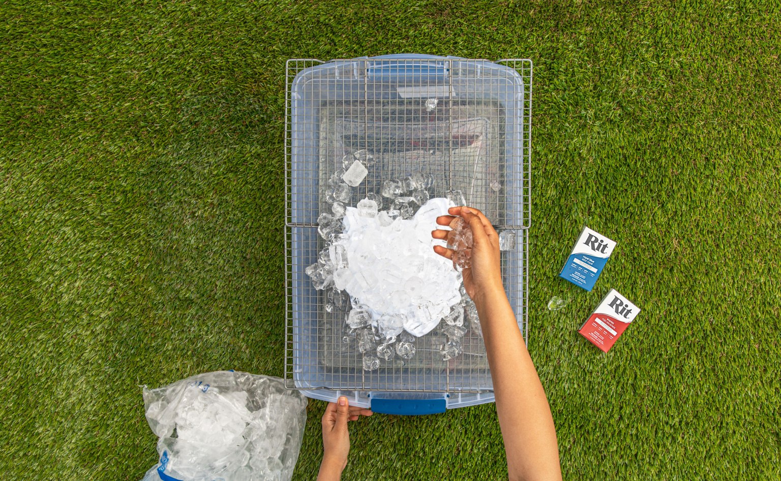 This technique must be done with Rit All-Purpose Powder Dye. Accordingly: (1) you cannot use liquid dye; and (2) you can only ice dye natural fabrics (such as cotton, linen, wool, silk and ramie) and also rayon and nylon.