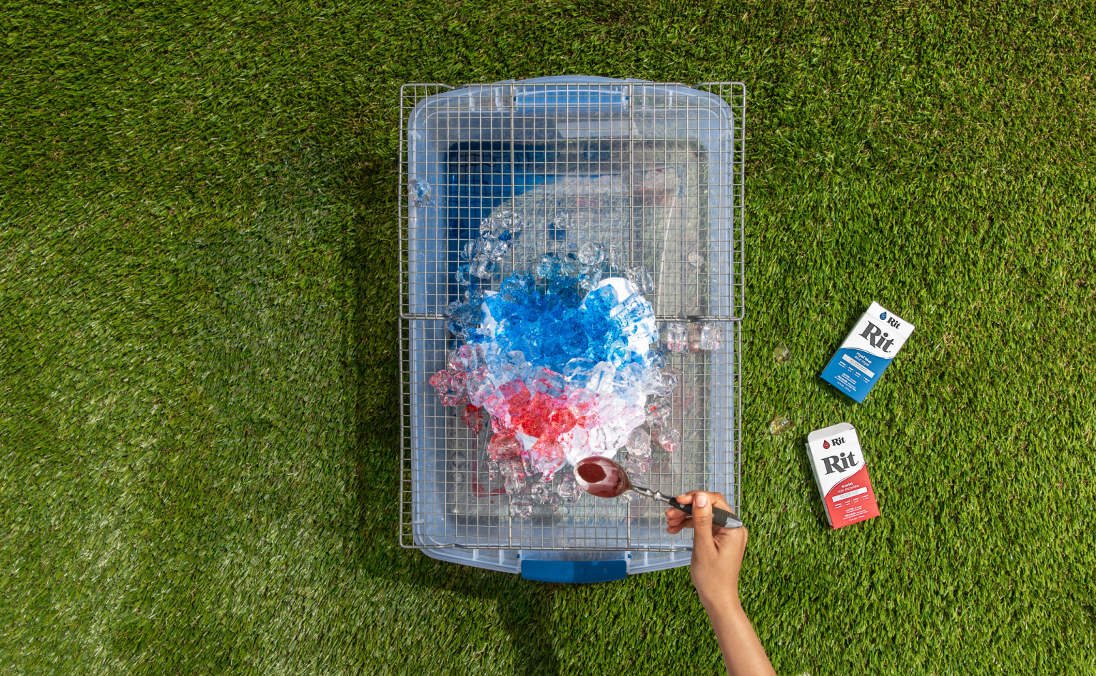 - Open dye packages. Use spoon to sprinkle dye on the ice.
